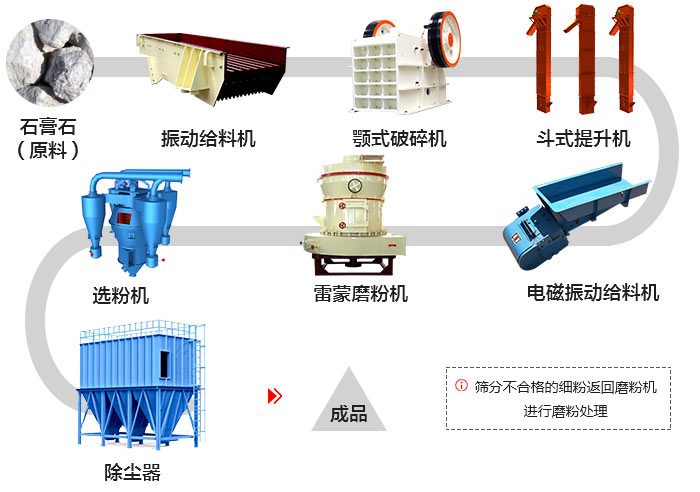 大塊的石膏石原料在給料機(jī)的作用下,并均勻、連續(xù)的送入顎式破碎機(jī)進(jìn)行粗碎加工,破碎后的石膏石在斗式提升機(jī)的作用下被送入料倉,之后由電磁振動(dòng)給料機(jī)均勻、定量的送到雷蒙磨粉機(jī)進(jìn)行磨粉加工,經(jīng)磨粉后的粉末在鼓風(fēng)機(jī)的租用下吹向分析機(jī)進(jìn)行分選,分選后的物料由廣島輸送到大旋風(fēng)收粉器,后經(jīng)出料口輸出。